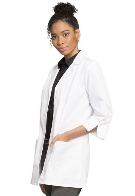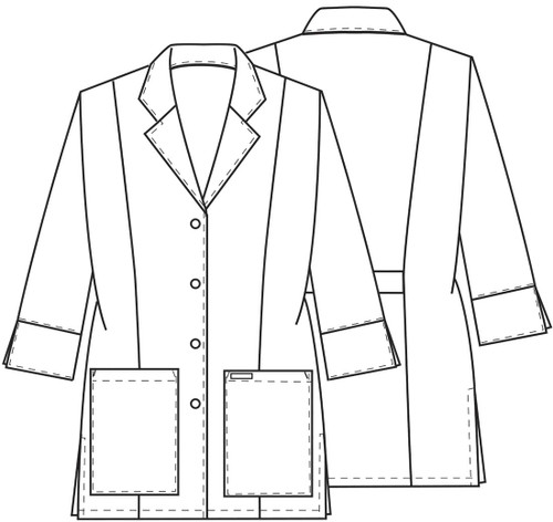 A Modern Classic fit, notched lapel lab coat features 3/4 sleeves with notched cuffs. Princess seaming provides easy shaping. Also featured are two patch pockets, side vents and center back belt with button detail. Center back length: 30"