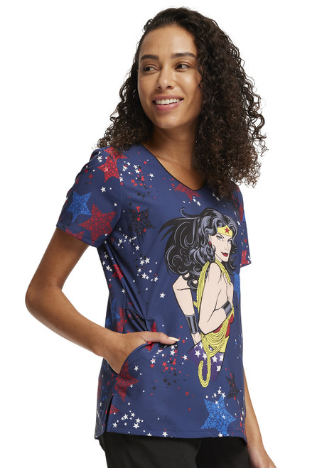 A Modern Classic fit V-neck top features neck piping, bust darts, side angled pockets, side vents, and back darts for shape. Center back length: 26"