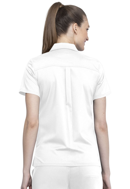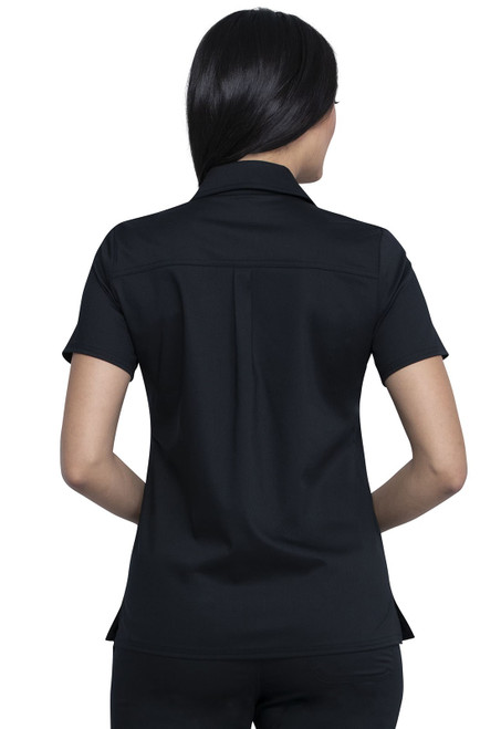 This classic collared shirt is clean, chic and offers a lot of storage space. Two deep side seam pockets allow easy access to your belongings and a chest pocket adds to the tailored look. An added back pleat and hidden snap front placket create an effortlessly classic top. Center back length: 26"