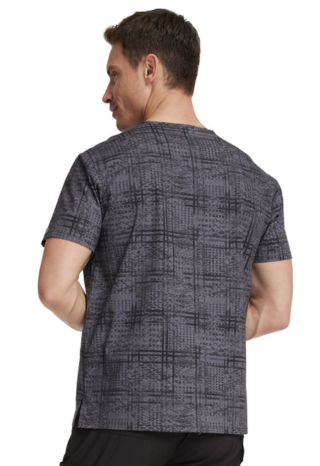 A Men's V-neck top features a chest pocket with bartacked pencil slot, and side vents. Center back length: 28"