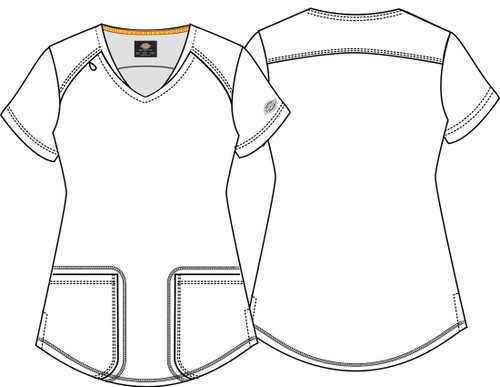 This Contemporary fit V-neck print top has front yoke seams, a bungee ID badge loop on the wearer's right yoke seam and a back yoke seam. Other features include two front patch pockets and side vents. Center back length: 26"