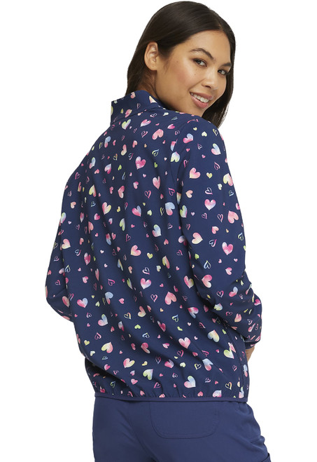 This ultra cool zip front print jacket has a stand-up collar and stylized front seams. There are also elastic cuffs and two zip pockets. The entire jacket packs up in the pocket bag and zips up for easy storage. Contemporary fit. Center back length: 23 1/2".