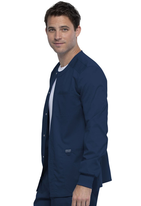 This men's snap front jacket is full of essential details; comfortable rib-knit cuffs, one chest pocket, two large patch pockets, a bungee loop, and a back yoke with a locker loop. Men's Modern Fit. Center Back: 30"