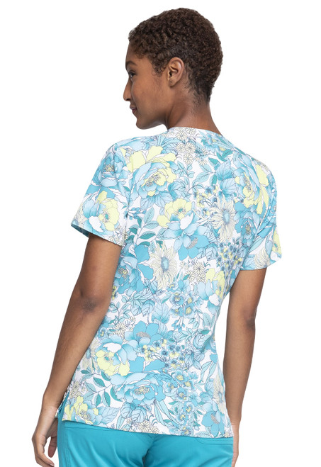 This Modern Classic mock wrap print top has two front patch pockets, instrument loops above the right pocket, and side vents. Center back length: 26".