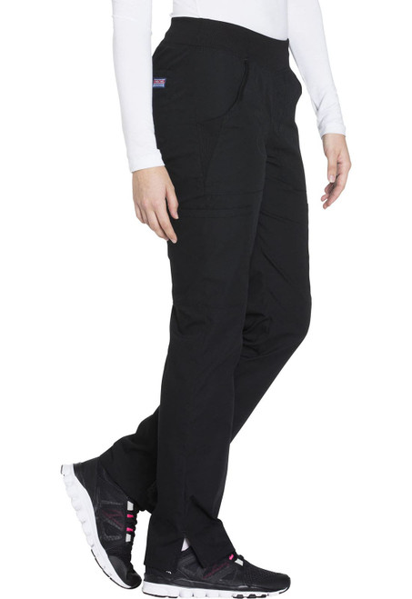 A Contemporary fit, mid rise, straight leg pant features a comfort-fit rib-knit waistband reinforced with inside elastic for extra support, and front patch pockets with rib-knit insets for expandability without sagging. Also featured are two cargo pockets, a pen slot, hidden instrument loop, back pockets and side vents. Inseam: 28 1/2"