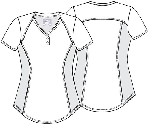 A Contemporary fit V-neck top features a two button front placket, two in-seam pockets, knit side panels and shirttail hem. Accent piping at the neck completes the look. Center back length: 25".