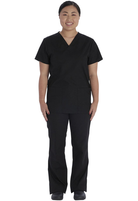 This Unisex fit top and pant set is a comfortable medical apparel staple, featuring a relaxed fit in both the V-neck top and mid rise, tapered leg, drawstring pant, and multiple patch pockets for all your storage needs. Top center back length: 28 1/2". Tapered leg, 18" opening. Inseam: 31"