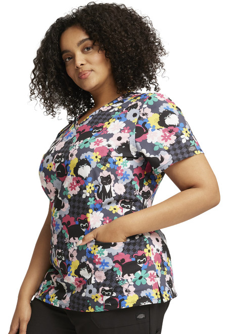 Clearance V-Neck Top Dickies Cats & Flowers Print