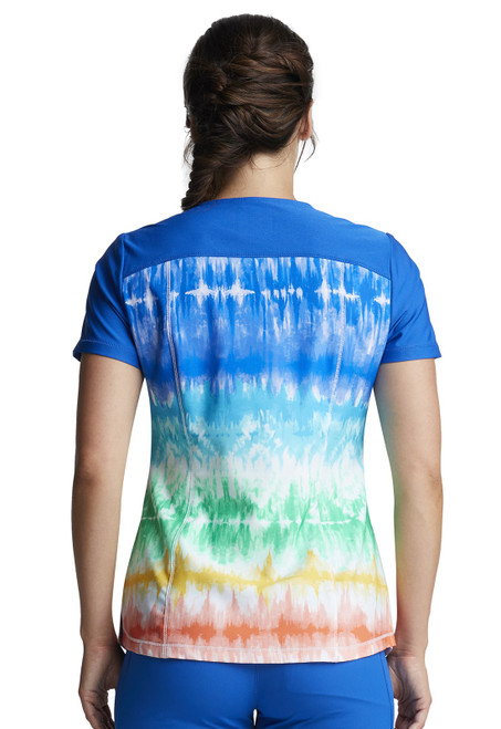 This Contemporary fit v-neck top features contrast yokes and sleeves. There is a bungee ID badge loop on the wearer's right neckline plus front and back princess seams for fit and shaping. There are two front welt pockets for storage. A shirttail hem and side vents complete the look. Center back length: 26".