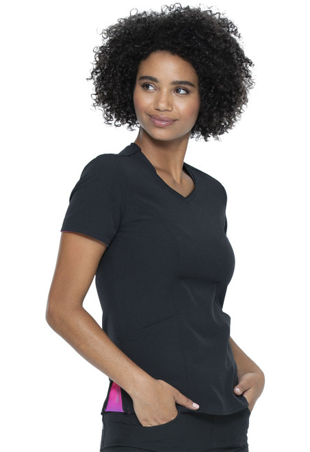 This Contemporary fit v-neck top with stylized neckline has angled back yoke seams and a rainbow ombre inset at the center back neck. There are front and back princess seams plus two front patch pockets. The sleeves roll up to show off the rainbow ombre contrast on the inside of the sleeve hems. Other features include zip side vents with rainbow ombre contrast gussets and a printed hidden message. A rounded hem completes the look. Center back length: 26"