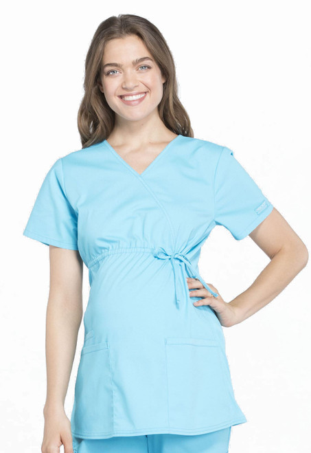A Maternity mock wrap top features an empire waist with functional side-tie drawstring, and soft, stretchy rib-knit side panels. Also featured are two patch pockets and a cell phone pocket. Our comfy Maternity styles are designed to support and flatter using your current size, so there's no need to size up. When ordering Cherokee Workwear Maternity styles, remember to order your pre-pregnancy size. Center back length: 27 1/2"